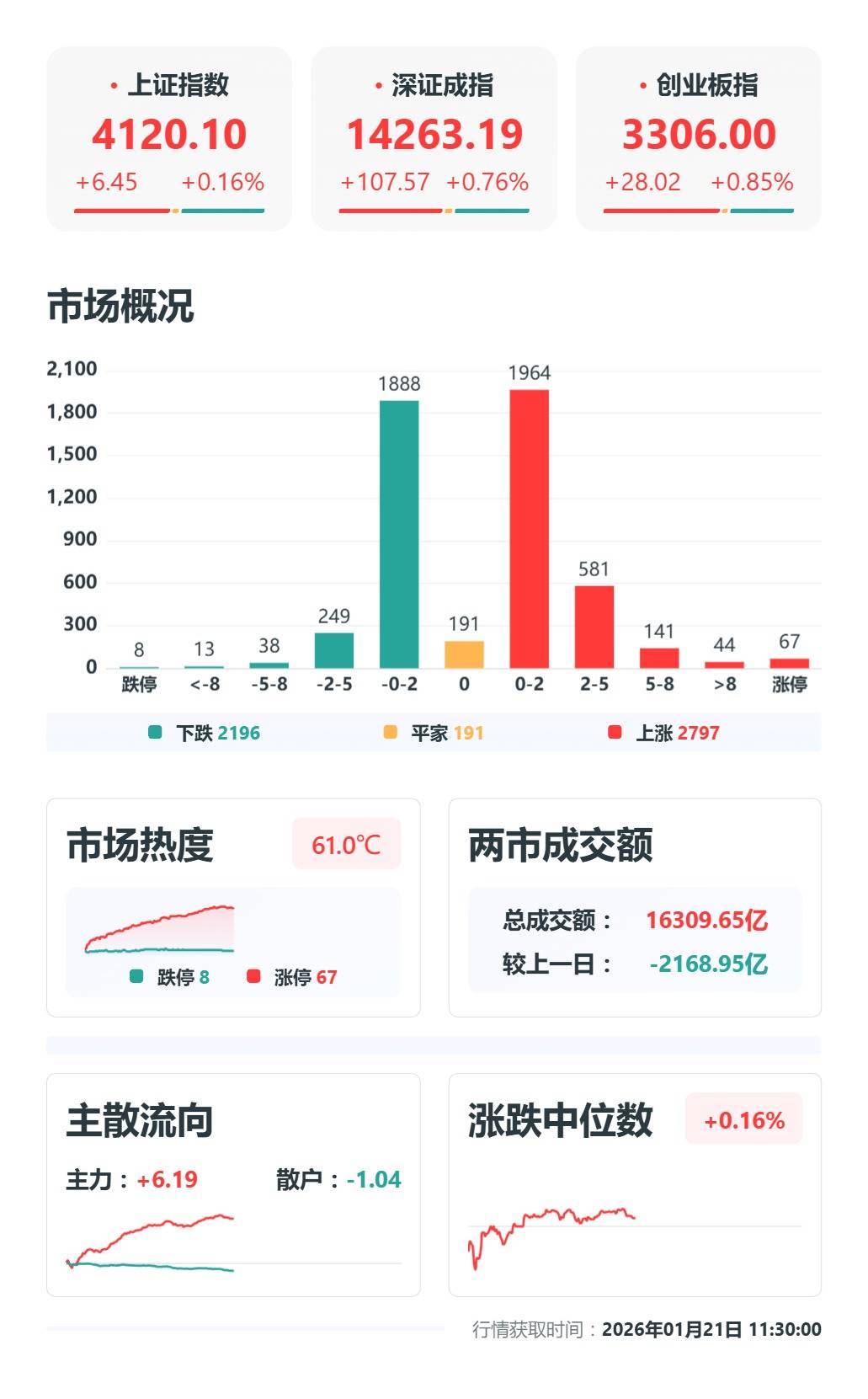 早盘A股三大指数低开高走,截至午间收盘,沪指涨0.16%,报4120.1点,深成指涨0.76%,报14263.2点,创业板指涨0.85%,报3306点,科创50指数涨2.96%,报1526.83点。沪深两市合计成交额16309.65亿元,全市场近2900只个股上涨。