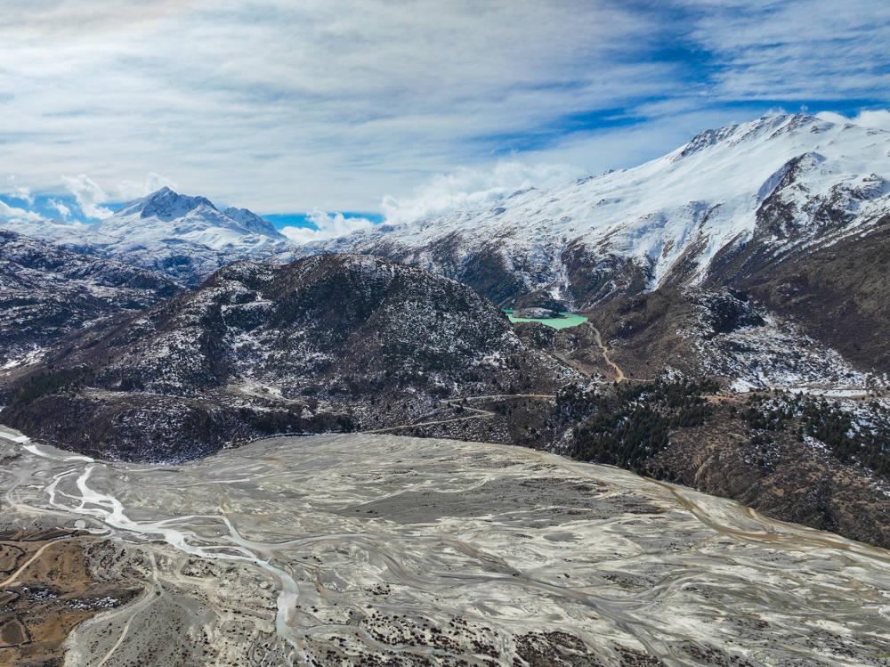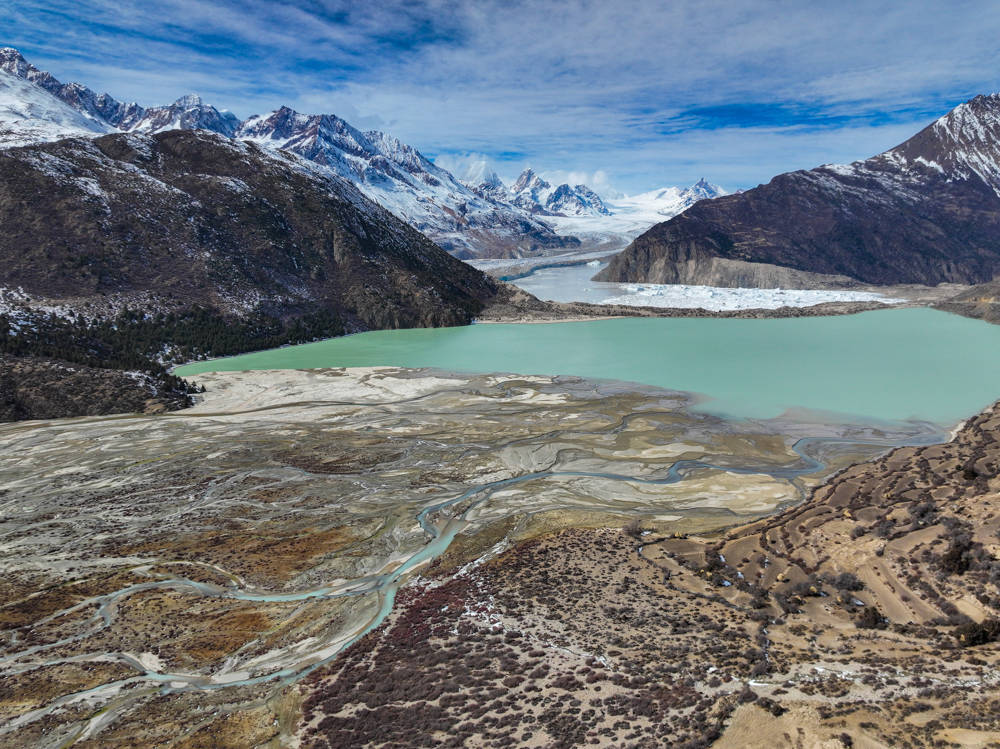 冬日时节,位于西藏昌都市八宿县境内的来古冰川与蓝天、湖泊相互映衬,景色壮美。