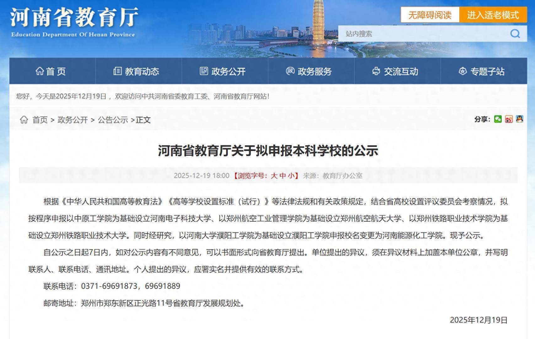 12月19日,河南省教育厅公示拟申报的本科学校。